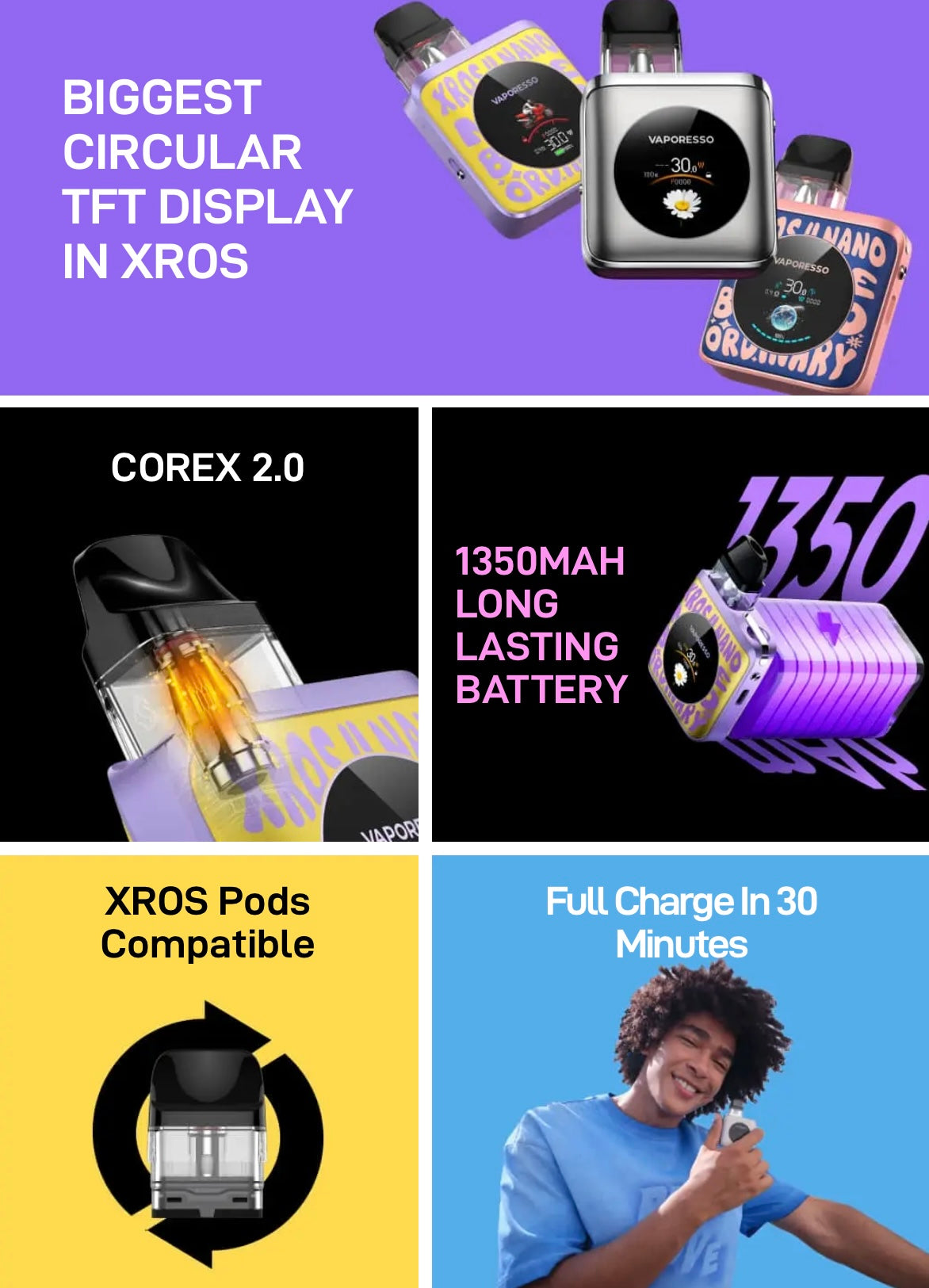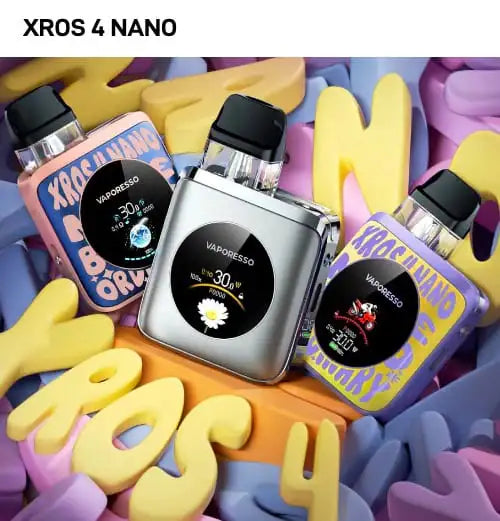 Discover the VAPORESSO XROS 4 Nano Kit, featuring a 1300 mah integrated battery, draw-activated firing mechanism, and delivers outstanding flavor and vapor.